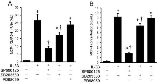 Involvement of the MAPK pathway in the IL-33-induced gene expression and protein secretion of MCP-1 was examined using pharmacological inhibitors of MAPK, such as SP600125 (JNK inhibitor), SB203580 (p38 MAPK inhibitor), and PD98059 (ERK1/2 inhibitor). HUVECs were pretreated with these pharmacological inhibitors for 2 h, followed by stimulation with IL-33 (10−9 mol/L) for 8 h to measure MCP-1 mRNA expression, and for 24 h to examine MCP-1 protein secretion from HUVECs. Real-time RT-PCR demonstrated that the IL-33-induced increase in MCP-1 mRNA expression was significantly suppressed by the pretreatment with SP600125 and SB203580 in HUVECs (Figure 5A). As shown in Figure 5B, the IL-33-induced increase in MCP-1 protein secretion from HUVECs was also significantly attenuated by the pretreatment with SP600125 and SB203580. In contrast, PD98059 had no effect on the IL-33-induced upregulation of gene expression or protein secretion of MCP-1 in HUVECs.