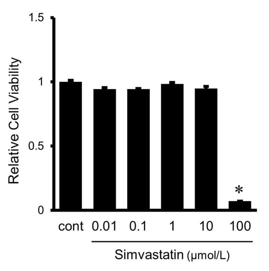 Effects of simvastatin on cell viability. HUVECs were treated with different concentrations of simvastatin for 24 h. Cell viability was measured by MTT assay. The results are expressed as percentage of the untreated control, and each value represents five independent experiments (n = 5). * p < 0.05 vs. untreated control (cont).