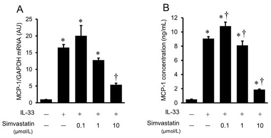 Effects of simvastatin on gene expression and protein secretion MCP-1 in HUVECs. IL-33-induced MCP-1 gene expression (A) and MCP-1 protein secretion (B) were suppressed by simvastatin. HUVECs were treated with IL-33 (10−9 mol/L) for 8 h (A) or 24 h (B) with or without pretreatment with simvastatin (0.1 to 10 μmol/L). Bars represent MCP-1 mRNA after normalization to GAPDH mRNA and relative to the untreated control in (A). Bars represent MCP-1 protein secretion per 105 cells in (B). * p < 0.05 vs. untreated control. † p < 0.05 vs. IL-33.