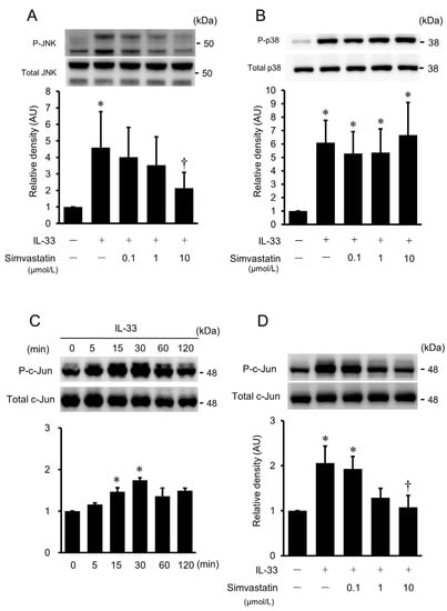 Effects of simvastatin on IL-33-induced phosphorylation of JNK, p38 MAPK, and c-Jun. (A,B) Simvastatin dose-dependently suppressed phosphorylation of JNK (A) but did not inhibit phosphorylation of p38 MAPK (B). HUVECs were pretreated with simvastatin and then incubated with IL-33 (10−9 mol/L) for 15 min. Bars represent results from densitometric analyses of each phosphorylation signal after normalization to total protein and relative to the untreated control. Blots are representative of three independent experiments. * p < 0.05 vs. untreated control. † p < 0.05 vs. IL-33. (C) Time course of IL-33-induced phosphorylation of c-Jun as evaluated by Western immunoblot analysis. HUVECs were treated with IL-33 (10−9 mol/L) for the indicated time periods. Bars represent results from densitometric analyses of each phosphorylation signal after normalization to total protein and relative to the untreated control (0 min). Blots are representative of three independent experiments. * p < 0.05 vs. 0 min. † p < 0.05 vs. IL-33. (D) Simvastatin dose-dependently suppressed phosphorylation of c-Jun. HUVECs were pretreated with simvastatin and then incubated with IL-33 (10−9 mol/L) for 30 min. Bars represent results from densitometric analyses of each phosphorylation signal after normalization to total protein and relative to the untreated control. Blots are representative of three independent experiments. * p < 0.05 vs. untreated control. † p < 0.05 vs. IL-33.