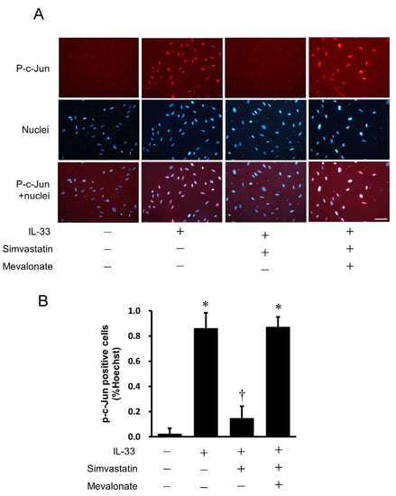 Effects of simvastatin on IL-33-induced translocation of phospho-c-Jun to the nucleus as determined by immunofluorescence staining. HUVECs were pretreated with simvastatin (10 μmol/L) or simvastatin plus mevalonate (100 μmol/L), followed by additional incubation with IL-33 (10−9 mol/L) for 30 min. (A) Representative immunofluorescence images showing the localization of phospho-c-Jun in HUVECs. Red staining indicates the specific Alexa staining for phospho-c-Jun, and blue staining indicates the nuclei (Hoechst 33342). Original magnification: ×400. Scale bar = 50 μm. (B) Percentages of phospho-c-Jun-positive cells relative to total cell numbers. * p < 0.05 vs. untreated control. † p < 0.05 vs. IL-33.