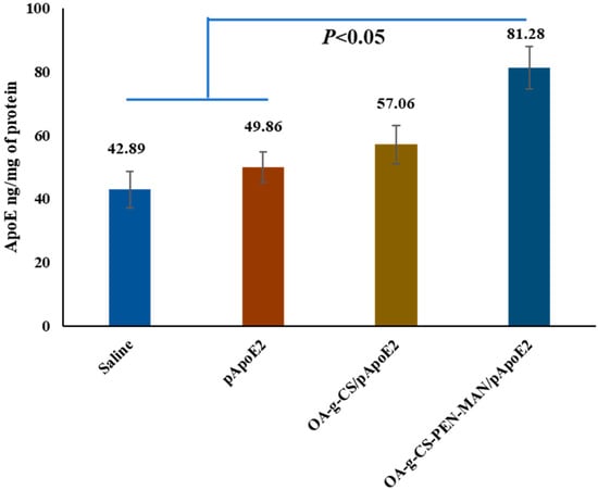 The quantitative in vitro pApoE2 transfection was performed in 24 well plates (1 × 105 cells/well) using primary astrocytes and neuronal cells. Cells were treated with saline, pApoE2 pDNA(1 µg), CS/pApoE2, OA-g-CS/pApoE2, OA-g-CS-PEN/pApoE2, OA-g-CS-MAN/pApoE2 and OA-g-CS-PEN-MAN/pApoE2 polyplexes in DMEM basal medium. After 4 h of incubation, treatment media was replaced with complete media and incubated for 48 h. Quantitative ApoE2 analysis in cell lysate supernatant media was done using the ApoE2 ELISA kit (Thermo Fischer Scientific, Waltham, MA, USA). The total amount of protein was normalized with BCA analysis [47].