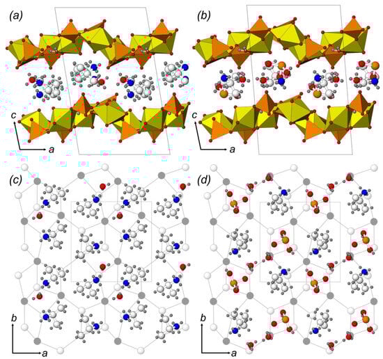 The crystal structures of 2 (a) and 4 (b): location of the interlayer species in the structures of 2 (c) and 4 (d) relative to the black-and-white graph of the inorganic layer. Legend: see Figure 1.
