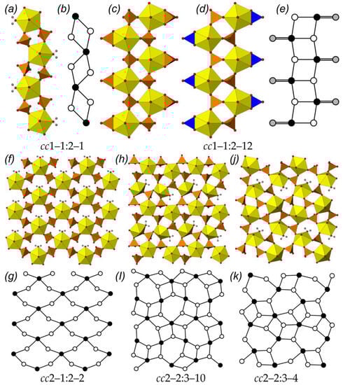 The most common topologies of the U-bearing substructural units among organically templated uranyl sulfate and selenate compounds: chains of cc1–1:2–1 (a) and cc1–1:2–12 (c,d) types and their black-and-white graphs ((b,e), respectively); layers of cc2–1:2–2 (f), cc2–2:3–10 (h), and cc2–2:3–4 (j) topologies and their respective graphs (g,i,k). Legend: see Figure 1; blue triangles = NO3 groups; gray nodes and double line = edge-shared TO4 tetrahedra or NO3 group.