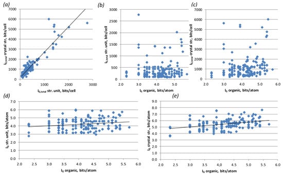 Correlation graphs of structural complexity parameters: complexity of U-bearing structural unit vs. complexity of the entire structure (a); complexity of organic molecule vs. complexity of U-bearing structural unit and of the entire structure per unit cell (b,c) and per atom (d,e).
