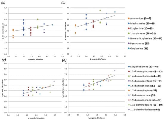 Thus, the most representative groups were the rows of chained amine and diamine molecules. For these groups, firstly, there was a long-term trend towards an increase in the hydrocarbon part of the molecule, and secondly, there were relatively large numbers of representatives to obtain better statistics. Both of these statements are more relevant to the group of diamines; however, in comparison with the other types of molecules, the statistics are, unfortunately, less obvious. As it can be seen from the graph (Figure 5), an increase in the length of the hydrocarbon moiety of the chain amine correlates both with an increase in the complexity of the entire structure (which is expected) and with an increase in the complexity of the uranyl-bearing substructural complex. Of course, the trend line cannot be called absolute, but rather a trend of the average complexity values for each of the molecules.
