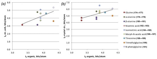 On the one hand, this trend is rather obvious: the more complex the structural unit, the more complex the structure is. However, one should keep in mind that the most accurate comparison and analysis of the calculated complexity values are possible for compounds with similar chemical compositions (polymorph modifications). Deviations in the chemical composition or, to be more precise, in a number of atoms in the crystal structure automatically create certain allowances, since the complexity parameters directly depend on the number and multiplicity of atomic sites. For example, a single H2O molecule introduces three atomic sites into the calculation. Therefore, organic molecules should contribute to the overall complexity due to the large number of atomic sites compared to the inorganic substructural unit. However, there is no such tendency observed in the graphs, if complexity values per unit cell are taken into account (Figure 4b,c). The situation becomes somewhat better when using complexity parameters per atom (Figure 4d,e). However, even here, there were no real trends, minor tendencies. This was mainly due to the fact that organic molecules with similar numbers of atoms had completely different functionalities (size, shape, number of amino groups, etc.), which presented different effects on the U-bearing structural complexes. Therefore, it made sense to consider some groups of molecules separately.
