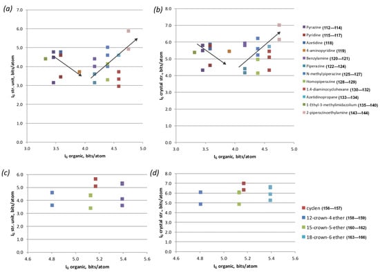 The importance of the number of atoms is well illustrated in the calculation of complexity parameters by the example of crown molecules (Figure 7c,d). Crown ether molecules do not contain amino groups and are electrically neutral within the structures of the corresponding compounds. Thus, the role of their size in the formation of more complex structures is not clearly traced. This is all the more obvious if one compares the molecules of 12-crown-4 ether and cyclene, which are nearly identical in size and shape. The presence of four amino groups in the structure of the latter, instead of four O atoms, firstly affects the complexity of the molecule itself (eight additional atoms), and secondly increases the complexity of substructural units due to the active participation of amino groups in a particular topology templating process.