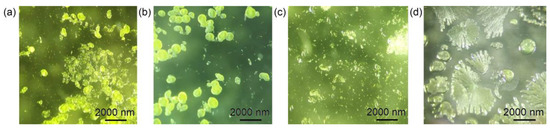 An attempt to crystalize the selenate compound isotypic to 1 was unsuccessful. An analysis of the crystalline precipitate showed that a [C3H10N]2[(UO2)2(SeO4)3(H2O)](H2O) (2) phase was formed, which was previously reported in [,]. To avoid the accidental crystallization of the compound 2, several experiments were performed in an extended range of initial reagent concentrations with approximately the same molar ratios. The best-quality single crystals of 2 were formed under the following conditions. An aqueous solution of 0.0880 g (0.18 mmol) of uranyl nitrate was dissolved in 2 mL of deionized distilled water. Then, 0.220 mL (1.79 mmol) of H2SeO4 (40%) and 0.006 mL (0.07 mmol) of isopropylamine were added to the solution, which was stirred until all solid material dissolved. The resulting yellowish transparent solution was left to evaporate in a watch glass at room temperature. The formation of crystals started in 2 days (Figure 8b). Although the crystal structure of 2 was previously described [,], we reported here on the refinement of its structural model with better precision.