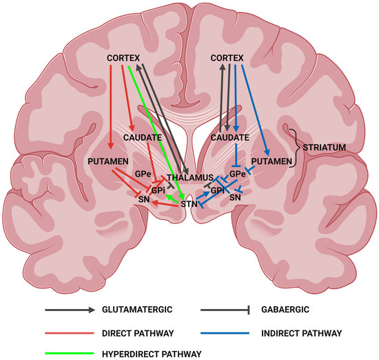 Coronal section of the human brain outlining the basal ganglia. Major signalling pathways of the basal ganglia include the direct, indirect, and hyperdirect pathways. The direct and hyperdirect pathways coordinate excitation of the cerebral cortex. The indirect pathway inhibits cortical excitation. In HD, the medium spiny neurons of the striatum projecting into the globus pallidus are degenerated. GPe, globus pallidus externa; GPi, globus pallidus interna; SN, substantia nigra; STN, subthalamic nucleus. Created with BioRender.com (accessed on 14 January 2023).