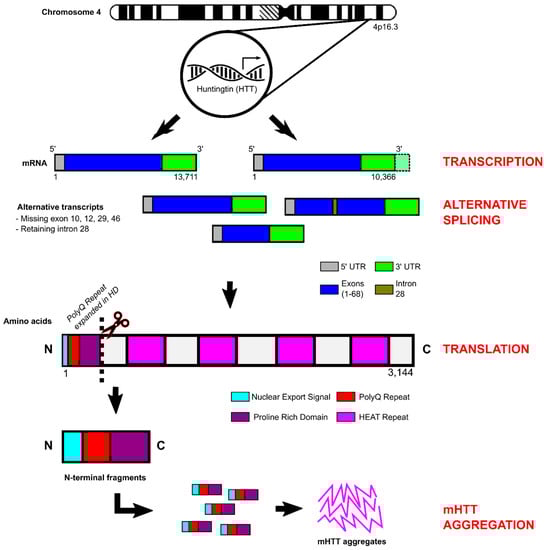 The huntingtin gene (HTT) contains 67 exons and is processed to form two alternate mRNA transcripts of 10,366 bp and 13,711 bp that differ by the exclusion/inclusion of a proportion of the 3′UTR (Figure 2) [102]. In addition, alternative splicing generates several huntingtin isoforms all with relatively low abundance, with transcripts lacking exons 10, 12, 29, and 46 or retaining a 57 bp portion of intron 28. Interestingly, expression of these rare variants is upregulated in HD and may impact gene functionality [103,104]. The protein encoded by HTT (wild-type polyglutamine repeat length of 23 CAG) consists of 3144 amino acids with a molecular weight of 348 kD [105]. HTT is ubiquitously expressed throughout most human tissues, but is highest in the nervous system, liver, and testes (http://www.gtexportal.org/home/gene/HTT (accessed on 14 January 2023), http://www.proteinatlas.org/ENSG00000197386-HTT/tissue (accessed on 14 January 2023).