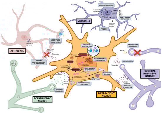 Proposed HD pathogenic mechanisms This figure shows possible Huntington disease mechanisms and the cellular location of the aberrant activity including excitotoxicity, dopamine imbalance, mitochondrial dysfunction, disruption of proteostasis, initiation of apoptotic pathways, transcriptional dysregulation, and neuroinflammation. Created with BioRender.com (accessed on 17 August 2023).