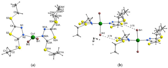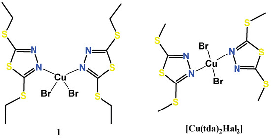 Literature review reveals that, similar to 1 complexes, Cu(tda)2Hal2 (Hal = Cl, Br) (tda = 2,5-bis(methylthio)-1,3,4-thiadiazole), whose ligand contains a thiomethylate group instead of a thioethylate group, are centrosymmetric, i.e., their Hal–Cu–Hal and N–Cu–N angles are strictly equal to 180° [30]. Moreover, the thiadiazole ligands in the Cu(tda)2Hal2 complexes are rotated by 180° relative to the N–Cu–N line (Figure 11). In the present case of complex 1, the ligands are located opposite to each other (the corresponding angle is ~4°). Different geometries of molecules cause the crystal packing in the complexes to be also different; namely, Cu(tda)2Hal2 contains intermolecular Hal⋯S contacts (Hal = Cl, Br), while the distances in 1 are significantly larger (the minimal distance in 1 is 3.74 Å, Figure 1b).