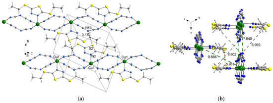 It is worth emphasizing that the Cu…Cu distances inside each chain alternate and are equal to 6.950 Å and 7.050 Å (Figure 2). In turn, the distances between the chains are significantly larger, the shortest of them being equal to 7.840 Å (Figure 3b). There are also S…N contacts between the chains: the shortest of them is the contact between the sulphur atom of the thiadiazole ring and the dicyanamide nitrogen atom (S2…N4 = 3.178(2) Å) (shown by dashed lines in Figure 3a), which is shorter than the sum of their van der Waals radii (3.45 Å).