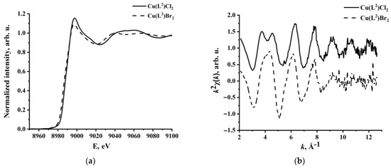 The experimental XANES and EXAFS spectra (Figure 4a,b) of Cu(L2)Cl2 (3) and Cu(L2)Br2 (4) differ significantly, thus indicating that Cu(II) ions occur in different coordination in these compounds. The simulations of experimental EXAFS spectra (Figure 5 and Figure 6) have shown that complex 3 is well described by the trimer structure (Figure 12a), while 4 conforms to the dimer one (Figure 12b).