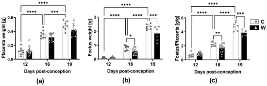 Placenta and foetus morphometric data from experimental groups, healthy (C) and tumour-bearing (W) dams at three distinct gestational periods, 12, 16, and 19 days post-conception: (a) placenta weight (g); (b) foetus weight (g); (c) ratio of foetal weight and placental weight. Data presented as mean ± standard deviation. Number of animals per group: C (placenta and foetus: 12 dpc n = 8; 16 dpc n = 8; 19 dpc n = 7); W group (placenta and foetus: 12 dpc n = 14; 16 dpc n = 12; 19 dpc n = 6). *, p < 0.05; **, p < 0.01; ***, p < 0.001; ****, p < 0.0001.