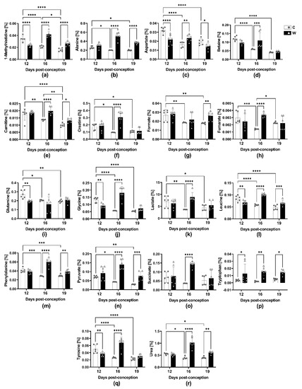 Maternal serum metabolite variations in healthy (C) and tumour-bearing (W) dams at three different gestational periods, 12-, 16- and 19-days post-conception. Number of animals per group: C at 12 dpc (n = 6), 16 dpc (n = 5) and 19 dpc (n = 6); W group at 12 dpc (n = 7), 16 dpc (n = 6) and 19 dpc (n = 6). For details see the Section 4. Legend: (a) 1-Methylhistidine; (b) Alanine; (c) Aspartate; (d) Betaine; (e) Carnitine; (f) Creatine; (g) Formate; (h) Fumarate; (i) Glutamine; (j) Glycine; (k) Lactate; (l) Leucine; (m) Phenylalanine; (n) Pyruvate; (o) Succinate; (p) Tryptophan; (q) Tyrosine; (r) Urea. The data were presented as the mean ± standard deviation. Statistical analysis was performed using a two-way ANOVA, and multiple comparisons were corrected using the post hoc test, specifically the multiple comparisons test. *, p < 0.05; **, p < 0.01; ***, p < 0.001; ****, p < 0.0001.