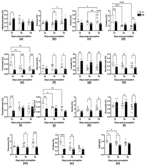 Placental metabolite variations in healthy (C) and tumour-bearing (W) dams at three different gestational periods, 12, 16 and 19 days post-conception. Number of animals per group: C at 12 dpc (n = 6), 16 dpc (n = 9) and 19 dpc (n = 6); W group at 12 dpc (n = 6),16 dpc (n = 8) and 19 dpc (n = 6). Legend: (a) 1-Methylhistidine; (b) Alanine; (c) Choline; (d) Creatine; (e) Fumarate; (f) Glucose; (g) Lactate; (h) Nicotinurate; (i) Pantothenate; (j) Pyruvate; (k) Serine; (l) Succinate; (m) Threonine; (n) Uridine; (o) Valine. The data were presented as the mean ± standard deviation. Statistical analysis was performed using a two-way ANOVA, and multiple comparisons were corrected using the post hoc test, specifically, the multiple comparisons test. Pregnancy: *, p < 0.05; **, p < 0.01; ***, p < 0.001; ****, p < 0.0001.