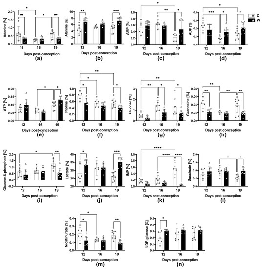 Foetal metabolite variations in healthy (C) and tumour-bearing (W) dams at three different gestational periods, 12, 16 and 19 days post-conception. Number of animals per group: C at 12 dpc (n = 6), 16 dpc (n = 6) and 19 dpc (n = 8); W group at 12 dpc (n = 8), 16 dpc (n = 7) and 19 dpc (n = 8). Legend: (a) Adenine; (b) Alanine; (c) AMP; (d) ADP; (e) ATP; (f) Choline; (g) Glucose; (h) Guanosine; (i) Glucose-6-phosphate; (j) Lactate; (k) IMP; (l) Succinate; (m) Nicotinurate; (n) UDP-Glucose. The data were presented as the mean ± standard deviation. Statistical analysis was performed using a two-way ANOVA, and multiple comparisons were corrected using the post hoc test, specifically the multiple comparisons test. *, p < 0.05; **, p < 0.01; ***, p < 0.001; ****, p < 0.0001.