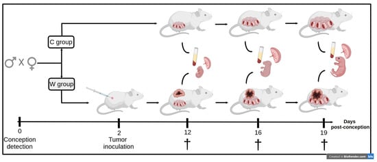 Experimental procedure to analyse serum, placental and foetal metabolomic profiles in pregnant tumour-bearing rats (W) compared to the healthy pregnant group (C). All the animals were euthanised at 12, 16 and 19 days of pregnancy. Illustration created using BioRender (accessed on 19 July 2023).