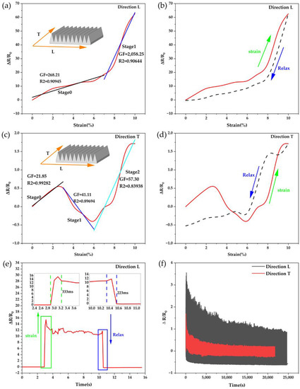 - The high-aspect-ratio V-groove has been designed to increase the sensor’s sensitivity and realize its anisotropy. This high-aspect-ratio V-groove design has enabled the sensor to achieve a 35.92-times-higher sensitivity variability in the mutually perpendicular directions L and T. Furthermore, the sensor has consistently maintained a high sensitivity in direction L across the entire operating range. It has exhibited a value of GF = 268.21 for stretching below 8% and a value of GF = 2058.25 for stretching between 8% and 10%. The sprayed Fe NWs solution and CNTs solution have formed a conductive network with excellent electrical conductivity, making the sensor preparation simple, with less-sensitive materials, and more economical.