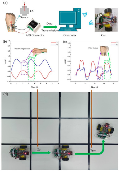- The double-layer structure sensors are assembled in a mutually orthogonal way as the input devices of HCI system to realize the remote control of the motion of a trolley, and this has effectively proven that the sensor preparation method proposed in this paper can be applied in the complex HCI field.