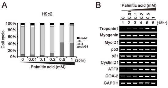 Hypertriglyceridemia implies increased plasma levels of fatty acids, which are taken up and stored in lipid droplets in the heart. Palmitic acid, a saturated fatty acid, is more lipotoxic than unsaturated fatty acids in cardiomyocytes [4,6]. In this study, we first treated H9c2 cells with concentrations of palmitic acid up to 1 mM for 20 h. Our cell cycle profile shows that palmitic acid induced the sub-G1 phase and suppressed the G1, S, and G2/M phases in H9C2 cells, indicated by corresponding changes in population (Figure 1A). Our RT-PCR analysis Troponin I mRNA was induced, myogenin and the MyoD mRNAs were slightly suppressed, and p53, cyclin D1, and p21 mRNAs remained constant after treatment with palmitic acid in H9C2 cells (Figure 1B). The gene expressions of activating transcription factor 3 (ATF3) and cyclooxygenase 2 (COX-2) were induced in a dose-dependent manner.