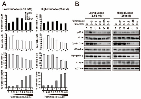 We further examined the effect of glucose concentration on the palmitic-acid-induced sub-G1 populations. Compared with 5.5 mM and 25 mM glucose, palmitic acid induced the sub-G1 phase and suppressed the G1 and S phases, as indicated by corresponding changes in population (Figure 2A). The populations of the G2/M phases were first increased and then returned to the basal level in response to palmitic acid under both concentrations of glucose. Decreasing amounts of myogenin protein and increasing amounts of ATF3 in response to palmitic acid were consistently observed in H9c2 cells (Figure 2B). However, p53, cyclin D1, and COX-2 proteins had inconsistent expression patterns, observed via their mRNAs.