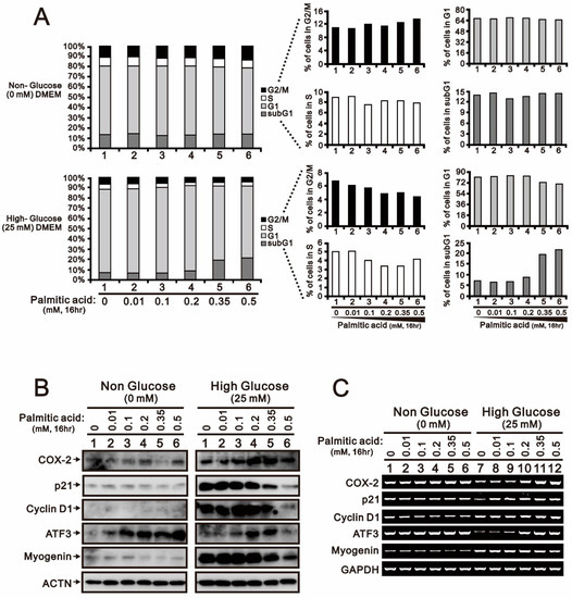 We failed to observe the effect of palmitic acid on the cell cycle profile, including the sub-G1 phase, when H9c2 cells were cultured in the absence of glucose (Figure 3A). Palmitic acid induced the sub-G1 phase and suppressed the G1, S, and G2/M phases in H9C2 cells cultured with 25 mM glucose, as evidenced by corresponding changes in population. The basal levels of COX-2, p21, cyclin D1, and myogenin proteins in 25 mM glucose-cultured H9c2 cells were higher than those in no-glucose-treated H9c2 cells (Figure 3B). The basal levels of COX-2, p21, and ATF3 mRNAs in no-glucose-cultured H9c2 cells were higher than those in 25 mM glucose-treated H9c2 cells (Figure 3C).