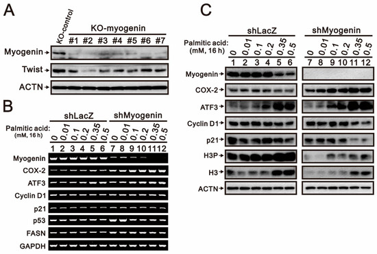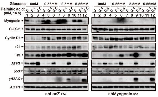 The suppression of myogenin mRNA and protein was consistently affected by palmitic acid in 0 mM and 25 mM glucose cultured H9c2 cells. Hence, we addressed the functional roles of myogenin when H9c2 cells were challenged by palmitic acid via the knockdown of the myogenin gene. We screened the most efficient effect of downregulation of the myogenin gene from seven short-hairpin myogenin (shMyogenin) constructs in H9c2 cells (Figure 4A). We reconfirmed the silencing effect on the myogenin gene via its mRNA and protein levels (Figure 4B,C). The basal mRNA levels affected by myogenin were those of COX-2 and p53, and the basal protein levels affected by myogenin were those of COX-2, p21, and histone H3. The response to palmitic acid was affected by myogenin for COX-2 mRNA and protein. We further examined the functional role of myogenin in H9c2 cells cultured with relatively lower glucose concentrations (Figure 5). The effects of palmitic acid on cyclin D1, H3, and γH2A.x were highlighted in myogenin-silenced H9c2 cells. The downregulation of p53 and upregulation of ATF3 by palmitic acid was observed in H9c2 cells treated with 2.5 mM and 5.56 mM glucose, regardless of myogenin expression.