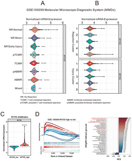 In order to comprehensively assess the role of myogenin in clinical myocardial tissue, we employed the GSE150059 myocardial tissue sample database. This database incorporates 1320 prospective biopsy samples from 645 patients across 13 international centers, 34,548,198 in total. With several transcriptomic fractions related to injury utilized as inputs, molecular damage was evaluated through prototype analysis. The molecular scores assigned using the Molecular Microscope Diagnostic System (MMDx)—Heart provide precision, accuracy, and standardization in heart transplant diagnostics that can be improved by incorporating central molecular biopsy assessments in the measurement of rejection and injury changes [34]. Our examination of myogenin expression followed the classification provided by the literature under different clinical conditions, including no rejection (NR) normal, NR minor, NR early injury, T-cell-mediated rejection (TCMR), antibody-mediated rejection (ABMR), mixed, and possible rejection (pABMR and pTCMR). The minor category is characterized by low-level inflammation in non-rejecting biopsies. Figure 7A illustrates a significant reduction in myogenin expression in myocardial tissues of varying injury degrees compared to normal tissues (NR normal). Injury is universal and programmed into the process of all organ transplants, including the stress of donation, preservation, and implantation “wounds”; additionally, the graft tissue evokes a response to wounding. Rejection-associated transcript-based analysis also identified an inflamed “early injury” state distinct from rejection that evokes inflammation and shares mechanisms with injury. However, no significant difference in myogenin expression was observed within the additional rejection and injury clusters documented in the literature (Figure 7B). Further, we normalized myogenin expression across all samples, categorizing samples with a Z-score greater than or equal to zero as MYOG_high and those with a Z-score less than zero as MYOG_low and performed further analysis using the Molecular Signatures Database (MSigDB) (Figure 7C). Conducting a GSEA stratified by myogenin expression and using the Hallmark gene set for the preliminary analysis of 50 major biological responses (Figure 7D) revealed that MYOG_high is associated with numerous immune responses. These include the interferon gamma response, interferon alpha response, TNF-alpha signaling via NF-κB, and IL6/JAK/STAT3 signaling. It may also influence the epithelial–mesenchymal transition and G2-M checkpoint of myocardial cells, corroborating our earlier research findings. This study provides important insights into the role of myogenin in the pathological processes of myocardial injury.