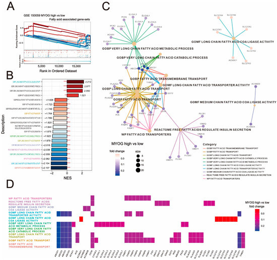 Considering the potential impact of fatty acids on myogenin, we selected gene sets related to fatty acids from Gene Ontology (GO) and analyzed the enrichment scores of these fatty-acid-related gene sets using GSEA (Figure 8A). Figure 8B outlines the normalized enrichment scores (NESs) for various fatty-acid-related gene sets, revealing that in clinical myocardial tissue, GOMF (Gene Ontology Molecular Function) long-chain fatty acid CoA ligase activity is the most significantly positively enriched gene set in MYOG_high samples. Conversely, multiple gene sets associated with fatty acid transport and metabolism, including GOBP (Gene Ontology Biological Pathway) fatty acid transport, GOBP very-long-chain fatty acid catabolic process, GOBP long-chain fatty acid transport, GOMF medium-chain fatty acid CoA ligase activity, GOBP very-long-chain fatty acid metabolic process, WP fatty acid transporters, GOMF long-chain fatty acid transporter activity, and GOBP fatty acid transmembrane transport, were all significantly negatively correlated (Figure 8B). Using clusterProfiler’s cnetplot analysis of the leading-edge gene distribution of the negatively enriched gene sets, we found that MYOG_high is related to the expression of specific gene families (Figure 8C). For instance, the SLC27A family was significantly upregulated, contributing to the positive enrichment of GOMF long-chain fatty acid CoA ligase activity. Meanwhile, families such as ELOVL, ABCD, PLA2G, and FABP were significantly downregulated, leading to the negative enrichment of various fatty-acid-transport-related gene sets. The expression and distribution of related gene families can be observed in the heat map provided in Figure 8D. This finding provides valuable insight into the differential role of fatty-acid-associated gene expression in cardiovascular tissues expressing elevated levels of myogenin.