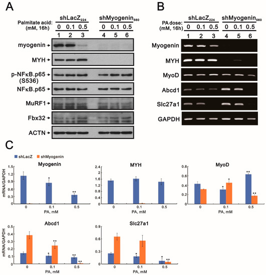 NF-κB might be a therapeutic target for muscular dystrophy because of the direct induction of muscle atrophy and the transcription of atrogin-1 and MuRF1 for protein degradation [20,28]. Figure 9A (Western blotting data) shows that NF-κB and two muscle E3 ligase proteins, MuRF1 and Fbx32, were not affected by palmitic acid treatment or the downregulation of myogenin in H9c2 cells compared with the suppression of myogenin by palmitic acid treatment and the induction of MHY (myosin heavy chain) by myogenin. We further focused on and verified Abcd1 and Slc27a1 genes in shMogyenin-H9c2 cells treated with palmitic acid to support the functional role of myogenin in heart transplantation. Our data show that the expression levels of Abcd1 and Slc27a1 genes, as well as the myogenin gene, were downregulated by palmitic acid in the H9c2 cells (Figure 9B). Our data suggest that myogenin might be a repressor of Abcd1 and Slc27a1 genes, an activator of the MHY gene, and neutral factor of the MyoD gene in H9c2 cells. High-concentration palmitic acid (0.5 mM) still suppressed the expression of Abcd1 and Slc27a1 genes in shLacZ and shMogyenin-H9c2 cells (Figure 9C). The negative or positive effect of palmitic acid on MyoD gene expression was dependent on its concentration in shLacZ and shMogyenin-H9c2 cells (Figure 9C).