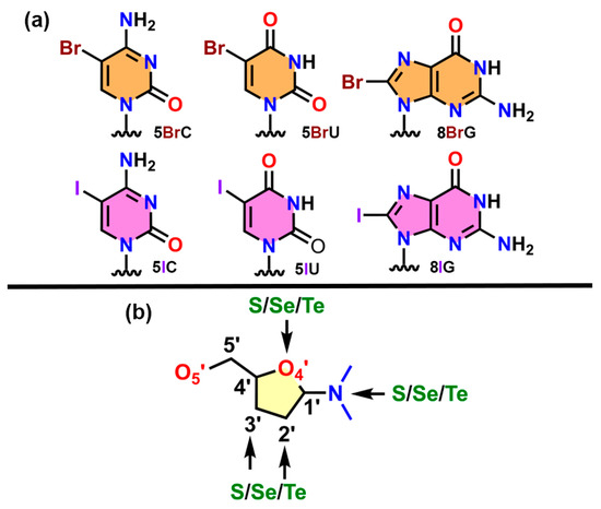 - In the case of halogens, only the incorporation of Br/I in the nucleobase (U, C, and G) was taken into account, while for chalcogens, the incorporation of S/Se/Te was considered in both the nucleobase and the sugar moiety (see Figure 1 above);