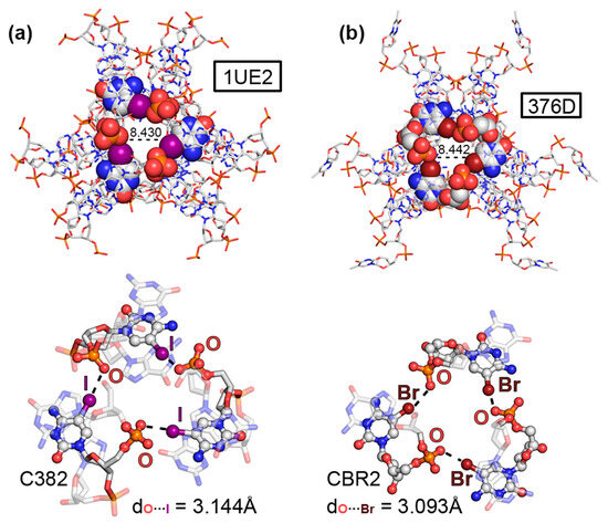 Four examples were retrieved from the PDB inspection involving halogenated nucleobases. The first two corresponded to structures 1UE2 [46] and 376D [47], involving two DNA fragments containing the sequences d(GICGAAAGCT) and d(GBrCGAAAGCT), respectively. Studies have demonstrated that similar sequences exhibit unconventional properties such as (i) abnormal mobility in electrophoresis [48], (ii) high thermostability [49], (iii) uncommon circular dichroism spectra [49], as well as (iv) unusual resistance against nuclease digestion [50]. In both cases, 5IC and 5BrC were used during the X-ray diffraction process by means of the MAD method [21]. A close inspection of both solid-state architectures revealed the formation of DNA helical duplexes in parallel disposition to the z-axis of the crystal lattice. This style of packing has been well studied in A and B NAs [51,52], and it is considered an important stabilizing effect in the crystal formation between two aligned symmetry-related helices. The DNA duplexes were associated in the form of a trimer, forming a molecular cavity (around 8.5 Å) in the middle of the structure (see Figure 2a,b). Interestingly, three symmetrically distributed HlgBs were established at the top and bottom parts of the assembly. These involved either iodine (in 1UE2) or bromine (in 376D) atoms acting as σ-hole donors and O atoms from vicinal phosphate groups as σ-hole acceptors, exhibiting O···I and O···Br distances shorter than the sum of the O/I and O/Br van der Waals radii (3.144 Å and 3.093 Å, respectively) and high directionality (O···I–C and O···Br–C angles of 168.3° and 162.2°, respectively). Theoretical calculations at the RI-MP2/def2-TZVP level of theory on a dimeric model revealed individual HlgB strengths of −16.6 and −12.8 kcal/mol, respectively, in line with the results obtained for charge-assisted HlgBs [53]. The presence of these three centered HlgBs was important for holding the DNA duplexes together, thus being a nice example of the potential application of HlgBs as a stabilizing agent in NA crystal structures.