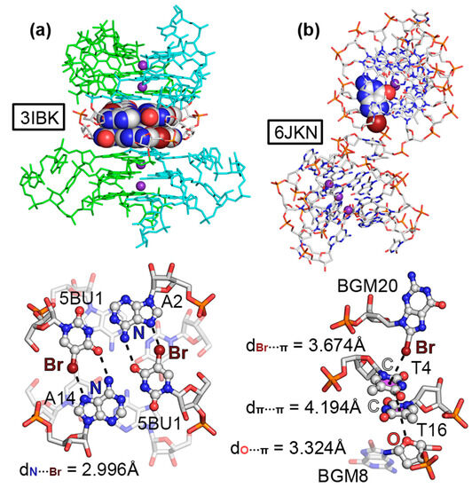 The third example encompassed structure 3IBK, which corresponded to a telomeric RNA G-quadruplex with the sequence (UBrAGGGUUAGGGU) [54]. G-quadruplexes are part of the noncanonical NA family of structures and are formed by the stacking of G-quartets, which are planar arrangements of four guanines held together by several HBs [55,56]. In the crystal packing of 3IBK, the asymmetric unit was composed by two RNA strands (colored green and ice blue in Figure 3a, respectively), each of which contained two G-rich repeats, folding into a parallel four-stranded bimolecular G-quadruplex. The structure also contained K+ ions in the center of the channel, positioned between the three G-quartets. Interestingly, 5BrU was incorporated into the RNA sequence, being crucial for the enhancement of crystal diffraction quality by holding the dimeric interface tightly together, as stated by the original authors. A close inspection of the structure revealed the formation of a mixed HB/HlgB base pair, involving the Br and O atoms belonging to 5BrU and the N7 and −NH2 group from adenine, located at the interface between two G-quadruplexes (see Figure 3a bottom for a detailed view of the interaction). The computed interaction energy of this noncanonical base pair reported a strength of −6.0 kcal/mol (in line with our recent study [31]) and a HlgB energetic contribution of −2.2 kcal/mol. Owing to the short N···Br distance (2.996 Å) and the directionality observed (157.2°), this example illustrates the potential role of halogenated base pairs in the stabilization of noncanonical nucleic acid structures.