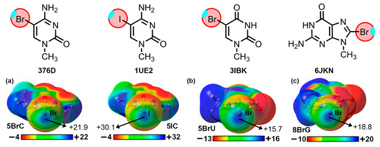 To demonstrate the implication of the Br and I σ-holes in the HlgBs described above, we have computed the Molecular Electrostatic Potential (MEP) surfaces of 5BrC, 5IC, 5BrU, and 8BrG at the RI-MP2/def2-TZVP level of theory (see Figure 4). As noted, in all cases, a positive potential surface was observed along the prolongation of either the C–Br or C–I covalent bonds (σ-hole), with values ranging between +15.7 and +30.1 kcal/mol. Also, in the case of 5BrC and 5IC, the iodinated derivative exhibited a more positive σ-hole potential, in line with the larger polarizability exhibited by the I atom, as it is commonly known [17]. The presence of these electrophilic regions made these biological synthons suitable for favorable interactions with electron-rich species (e.g., lone pair-bearing molecules or π-systems), such as the ones described in the structures shown above.