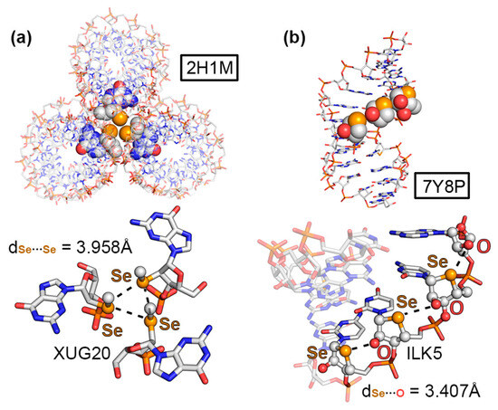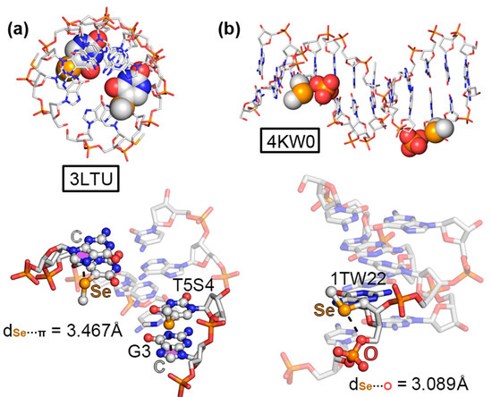 As the two last ChB examples, structures 3LTU [61] and 4KW0 [62], involved a DNA octamer containing 5-methylseleno-deoxyuridine and a DNA dodecamer containing 2′-methylseleno-guanine, respectively. As can be observed in Figure 6a,b, the methylseleno group established a ChB with (i) the π-system of a guanine ring (G3 in Figure 6a) and (ii) the lone pairs of a negatively charged O atom from a vicinal phosphate group (Figure 6b), with π···Se and O···Se distances of 3.467 and 3.089 Å, respectively. These interactions contributed to the stabilization of the DNA assemblies, with energetic strengths of −7.8 and −4.3 kcal/mol, serving as an alternative to classical HB and π–π stacking interactions.