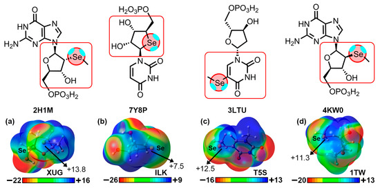 Building upon these previous reports, our aim was to investigate the plausible structural role of HlgBs and ChBs in the solid-state architecture of isolated NAs. To reach this goal, we conducted a search in the Protein Data Bank (PDB) [45], retrieving a total of 11 nucleic acid structures exhibiting highly directional HlgBs and ChBs in their solid-state architecture (see Figure 1 for the halogenated and chalcogenated molecules used). These contacts corresponded to either an intramolecular (e.g., within the same NA strand) or intermolecular (involving two neighboring NA chains) interaction and assisted in crystal packing formation. Calculations at the RI-MP2/def2-TZVP level of theory were conducted to shed light into the strength, directionality, and physical nature of the HlgBs and ChBs present in these structures by means of the Molecular Electrostatic Potential (MEP), the Quantum Theory of Atoms in Molecules (QTAIM), and NCIplot (Non Covalent Interaction plot) and Natural Bonding Orbital (NBO) techniques. We believe that the results derived from this study might be important to those scientists working in the fields of NA or protein engineering and σ-hole-based chemistry, as well as in the development of NA-based materials.
