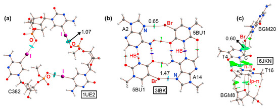 Lastly, in the case of the 6JKN structure (Figure 8c), the QTAIM analysis involved an assembly of NCIs spawning from an HlgB involving the π-system of thymine (T4) as an electron donor moiety (revealed by the BCP and bond path connecting the Br and C atoms from both counterparts), a π–π stacking interaction between two thymine rings (T4 and T6, mainly involving a C···N BCP), and finally, a lp–π interaction between T16 and the sp3 O atom from a pentose ring (denoted by the BCP and bond path connecting the O with a C atom from the nucleobase).