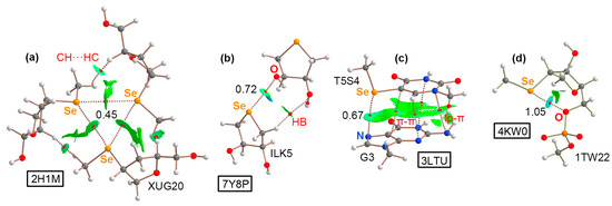 In the case of the 7Y8P structure (Figure 9b), the analysis was carried out on a dimer, and a O···Se ChB was characterized by the presence of a BCP and bond path connecting both atoms. In addition, an ancillary HB was also denoted by the presence of a BCP that connected a CH group and an O atom from the two selenated sugar moieties.