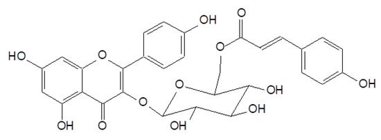 It is reported that many natural plant-based chemical compounds possess anti-cancer properties. They are able to impair and even kill cancer cells without being toxic to healthy cells [3,4,5]. The main group of such compounds is polyphenols, widely distributed in the plant kingdom. They may reveal their anti-cancer effects through different mechanisms, including the regulation of cell cycle signaling, elimination of anti-cancer agents, anti-oxidant enzyme activity, apoptosis, and cell cycle arrest [6,7]. There are clinical trials that attempt to correlate polyphenolic intake with the prevention of specific cancers or the diminished recurrence of cancer after the consumption of flavonoids or food rich in them [8]. The representative of such compounds is tiliroside, glycosidic dietary flavonoid (kaempferol 3-O-β-D-(6″-E-p-coumaroyl)-glucopyranoside) (Figure 1) [9]. Many pharmacological properties have been reported for tiliroside, including anti-diabetic, anti-inflammatory, anti-microbial, anti-oxidant, anti-viral, as well as anti-cancer [10,11,12,13,14,15,16]. The regulation of MAPK/JNK/p38 axis, NF-κB signaling pathway, and apoptosis induction have been reported in leukemia cells as proposed mechanisms of tiliroside action [17].