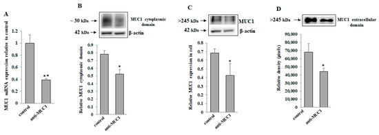 The effect of anti-MUC1 monoclonal antibody on MUC1 mRNA, MUC1 cytoplasmic domain, MUC1 in cell lysates, and extracellular domain in culture medium. AGS gastric cancer cells were incubated for 24 h with 5 µg/mL concentration of anti-MUC1 mAb. mRNA was assessed by quantitative Real-Time PCR (A). The results are presented as a relative fold change in mRNA expression of the gene in comparison with the gene in untreated control, where expression was set at 1. ±SD are the mean of triplicate cultures. ** p < 0.01. The cytoplasmic domain of MUC1 (B), MUC1 in cell lysates (C), and MUC1 in culture medium (D) was determined by Western blotting analysis. As a protein loading control, β-actin was applied. The bands’ intensities were quantified by densitometric studies. Data represent the mean ± SD of triplicate cultures. * p < 0.05 compared to control.