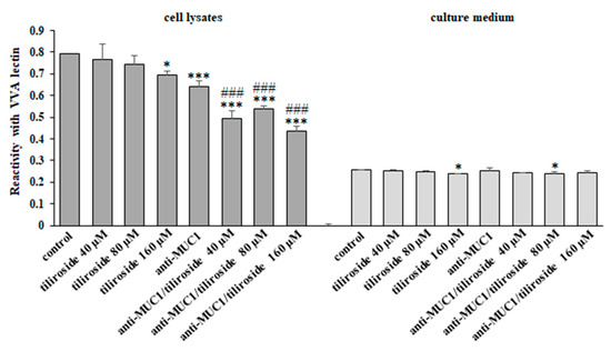 VVA lectin detected the presence of Tn antigen in cell lysates and the culture medium. The results of the ELISA test showed the suppression of Tn antigen expression in cell lysates by 160 µM tiliroside as well as by anti-MUC1 and mAb together with all concentrations of flavonoid. In the culture medium, a slight inhibitory effect was seen for only 160 µM tiliroside and 80 µM of flavonoid together with mAb (Figure 3).