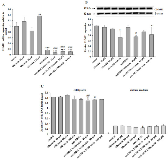 Core 1 β1,3-galactosyltransferase (C1GalT1) enables the formation of T antigen (Galβ1,3-GalNAc-O-Ser/Thr). In Figure 4A, the strong inhibitory effect of anti-MUC1 and mAb combined with all used concentrations of tiliroside on C1GalT1 mRNA expression is presented. In the case of the C1GalT1 protein, such an effect was revealed only by 160 µM tiliroside and 40 µM flavonoid combined with anti-MUC1 (Figure 4B). PNA is lectin with a high affinity to T antigen. The ELISA test with this lectin revealed only a slight suppression of T antigen expression in cell lysates by the lowest concentration of flavonoid. In the culture medium, the inhibitory effect is seen only after anti-MUC1 action (Figure 4C).