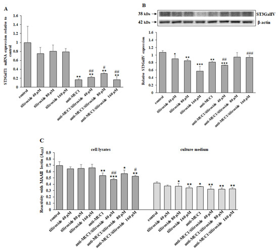 Gal α2,3-sialyltransferase (ST3GalT1) is responsible for sialyl T antigen formation. Anti-MUC1 and mAb combined with tiliroside action decreased ST3GalT1 expression (Figure 5A). The inhibitory effect of tiliroside, mAb, and antibody combined with 40 and 80 µM of flavonoid on ST3GalIV protein expression is presented in Figure 5B. MAAII lectin (with affinity to SAα2,3-Gal; sialyl T antigen), applied in the ELISA test, enabled the detection of the inhibitory effect of anti-MUC1 as well as mAb with tiliroside action on sialyl T antigen expression in cell lysates. Slight suppression of this antigen was also demonstrated in the culture medium by the action of 80 and 160 µM tiliroside, mAb, and mAb combined with the flavonoid (Figure 5C).
