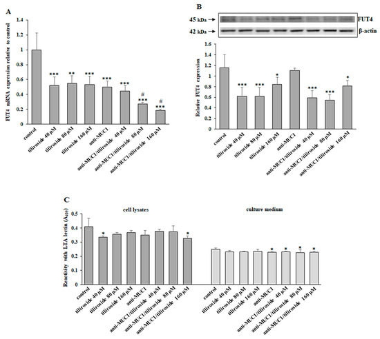 α1,3-fucosyltransferase (FUT4) is the enzyme responsible for the Fucα1,3-GalNAc structure formation. FUT4 mRNA was significantly diminished by all applied combinations of compounds. The effect was enhanced by the combined action of mAb and tiliroside (Figure 6A). FUT 4 protein expression was inhibited by tiliroside alone and combined with anti-MUC1 but not by mAb used without the flavonoid (Figure 6B). The level of inhibitory effect was similar after the action of the flavonoid separately and with mAb. LTA lectin revealed the level of fucosylated antigen (Fucα1,3-GalNAc) in cell lysates and culture medium. The inhibitory effect was observed for only 40 µM tiliroside and 160 µM flavonoid combined with anti-MUC1 in cell lysates. In the culture medium, suppression was seen for mAb and mAb applied with all concentrations of tiliroside (Figure 6C).