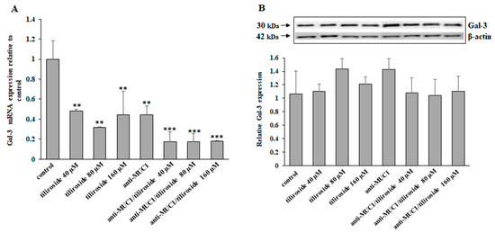 The effect of tiliroside and anti-MUC1 on Gal-3 mRNA and Gal-3 protein expression in cell lysates. The cells were incubated for 24 h with 40, 80, and 160 µM tiliroside, 5 µg/mL anti-MUC1, tiliroside + anti-MUC1. Gal-3 mRNA was assessed by quantitative Real-Time PCR (A). The results are presented as a relative fold change in the mRNA expression of the gene in comparison with the gene in the untreated control, where expression was set at 1. ±SD are the mean of triplicate cultures. ** p < 0.01, *** p < 0.001 compared to control. Gal-3 protein expression was determined by Western blotting (B). β-actin was applied as a protein loading control. The bands’ intensity was assessed by densitometric analysis. Data represent the mean ± SD of triplicate culture.