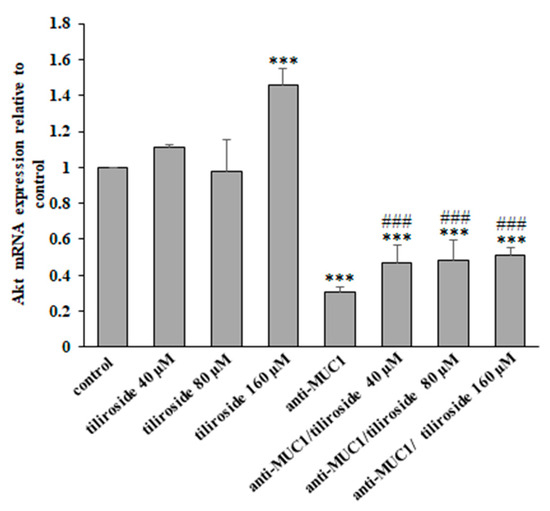 The effect of tiliroside and anti-MUC1 on Akt mRNA. The cells were incubated for 24 h with 40, 80, and 160 µM tiliroside, 5 µg/mL anti-MUC1, tiliroside + anti-MUC1. mRNA was assessed by quantitative Real-Time PCR. The results are presented as a relative fold change in the mRNA expression of the gene in comparison with the gene in the untreated control, where expression was set at 1. ±SD are the mean of triplicate cultures. *** p < 0.001 compared to control; ### p < 0.001 compared to tiliroside monotherapy.