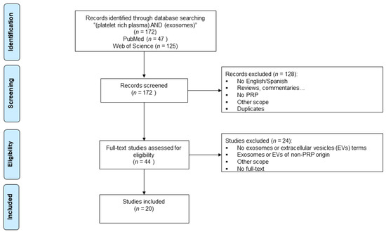 In the first phase, the articles from both databases were screened based on the title and the abstracts to determine their suitability. Subsequently, all the full-text articles assessed for eligibility were examined to determine their inclusion. For data extraction, an evidence table was created with Microsoft Excel. The following data were included: author and year of publication, study type, the field of application, experimental system, PRP-related issues (origin, type of anticoagulant, presence or absence of leukocytes, type of activator, exosomes or EVs) isolation, exosomes or EVs-related issues (isolation, storage conditions, characterization methods, size, fractions), comparison groups, exosomes concentrations, methods, and summary results.